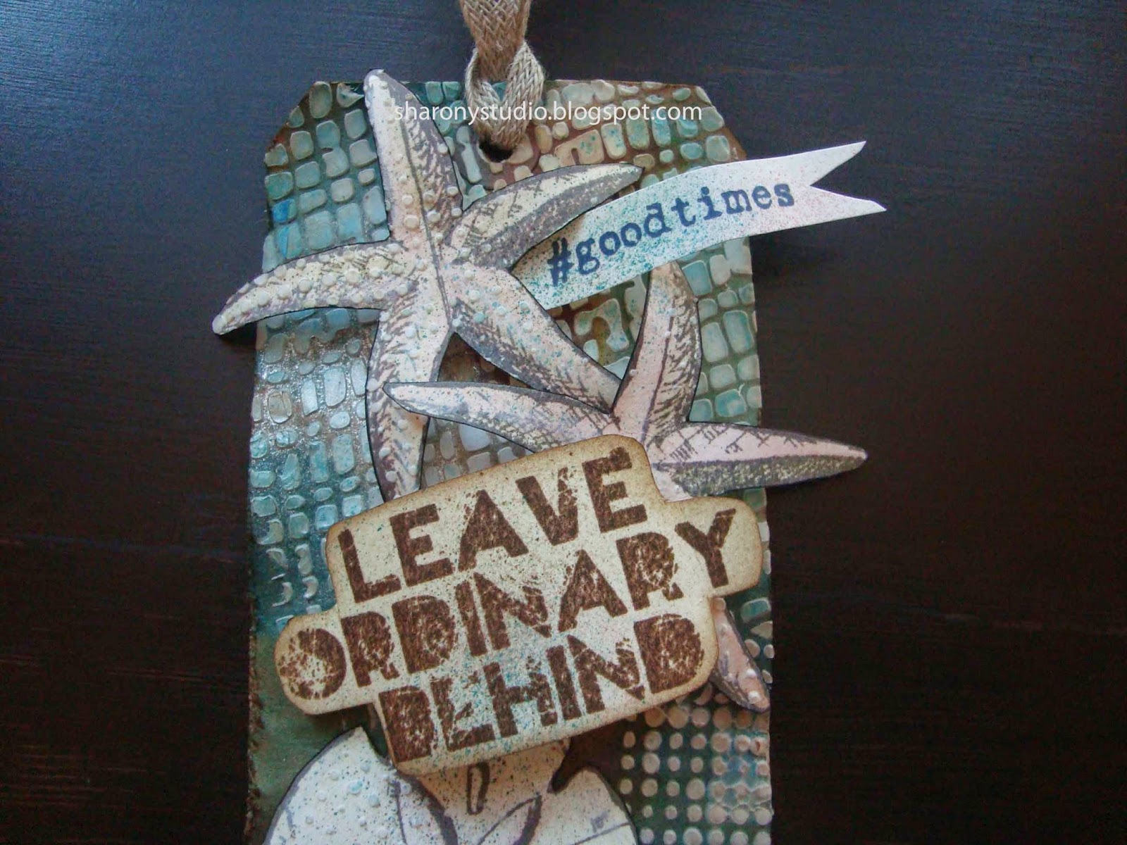 Distress colors on this tag were Faded Jeans, Broken China, Salty Ocean and Peeled Paint. The compass from the Travel Blue Print (CMS148) was my focal image. The sentiment is from Random Quotes set (CMS182).